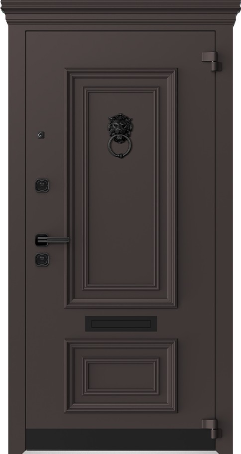 ВНЕШНЯЯ ОТДЕЛКА: Оцинкованная сталь (окраска на выбор), декор. алюм. штапик (классич. дизайн), капитель, декор. стучало «лев» (цвет черный), отбойник (цвет черный), декор. почтовый ящик (цвет черный).